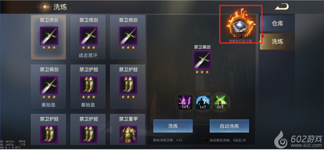 2. 75级开启套装系统,有多余的洗炼次数可以开始洗炼了,洗炼出现三个相同的满级技能时,可以激活一个相同技能的满级秘技。