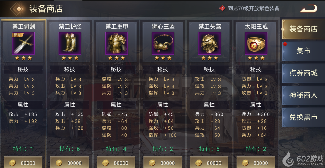 2. 跟随主线到53级后,会开启装备商城,并上架蓝色装备,需要为自己每个上阵的武将买一套(后面可以原价卖出不用担心浪费),57级的副本存在卡点,需要靠装备过去。